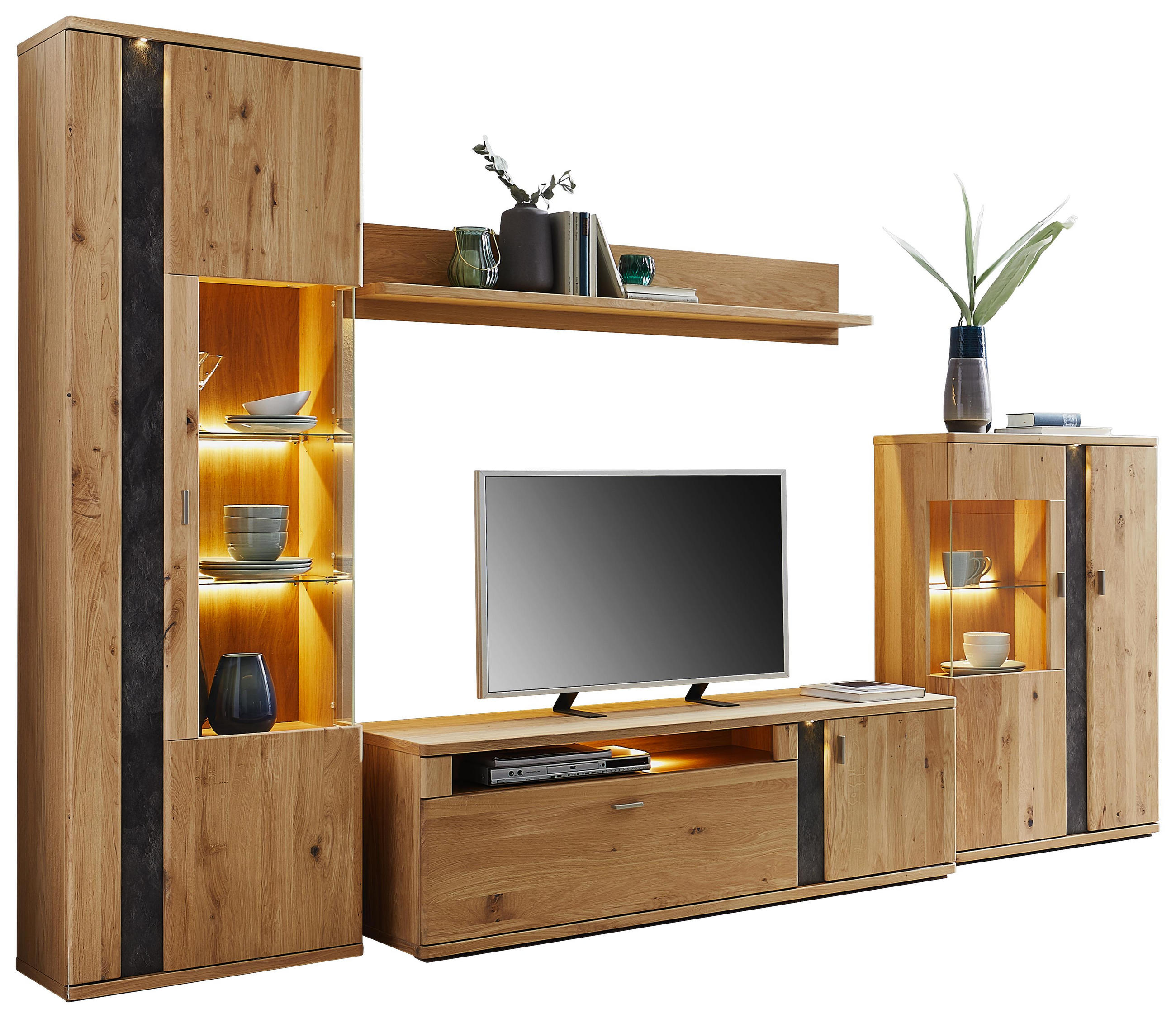 Zeitgemäße akzente aus glas sowie integrierte beleuchtungsmittel lassen die wohnwand zum eindrucksvollen blickfang werden. Wohnwand eiche furniert massiv eichefarben. Vitrine barfach großen schubfächern. Cantus gelingt es mit seinen schicken furnieren und dekorfolien die kundenwünsche bedarfsgerecht zu bedienen.