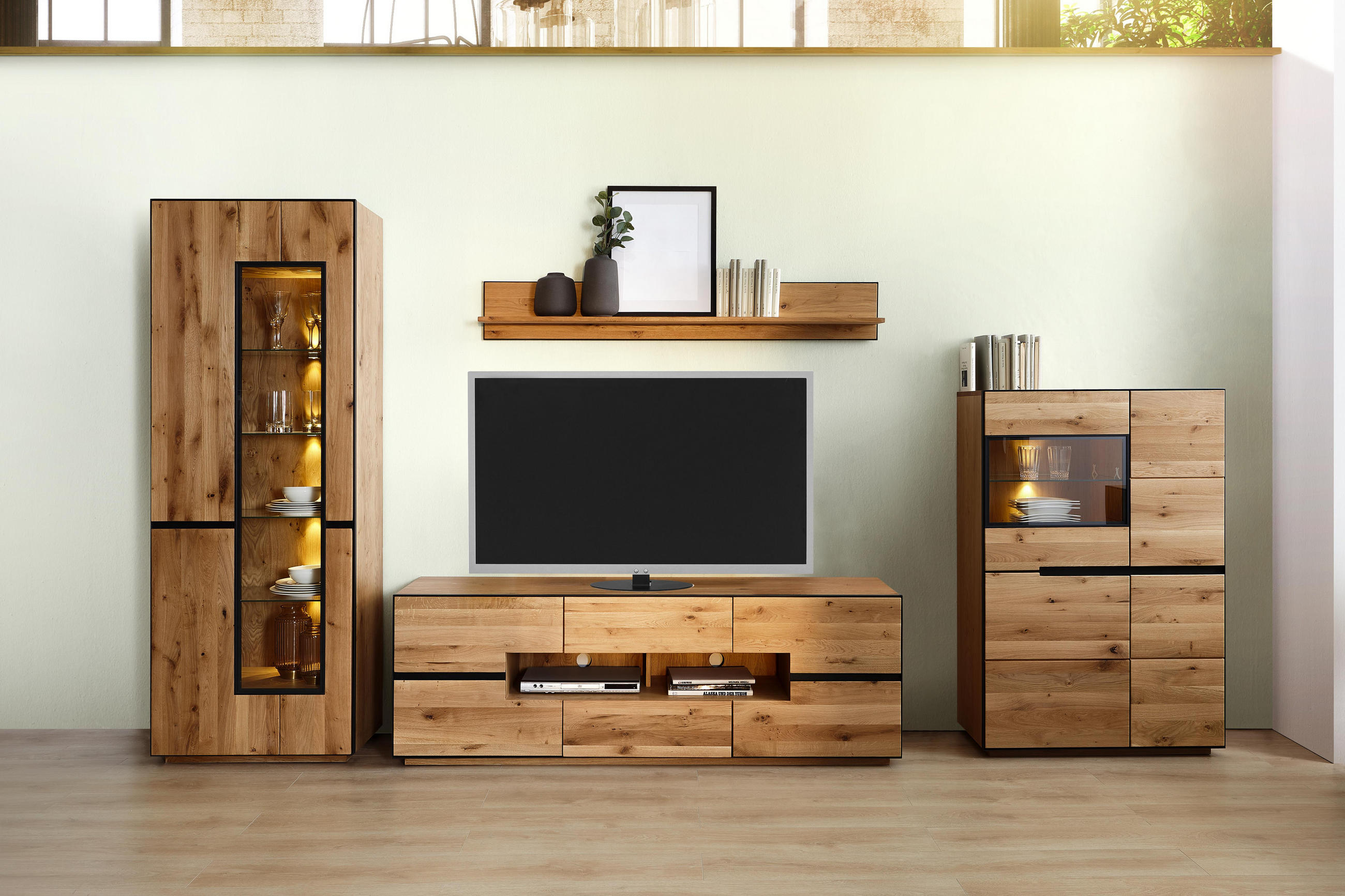 Wohnwand eiche massiv eichefarben. Cantus bevorzugt helle freundliche materialien in massiver oder teilmassiver ausführung dekore und lack für eine zeitlose optik. Lowboard foliert eichefarben. Vitrine eiche eichefarben.